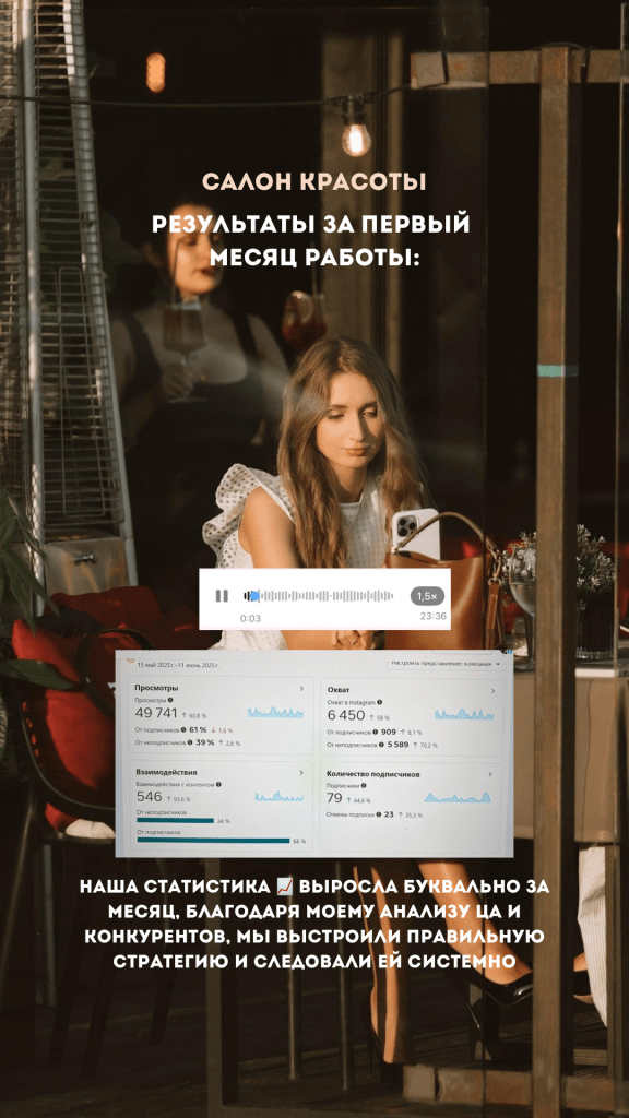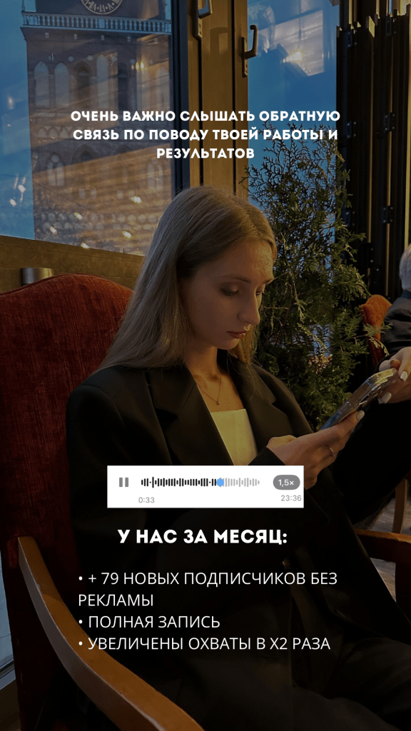 Без использования рекламы удалось привлечь +79 новых подписчиков, увеличить охваты в 2 раза и полностью заполнить запись в салон на месяц вперёд.